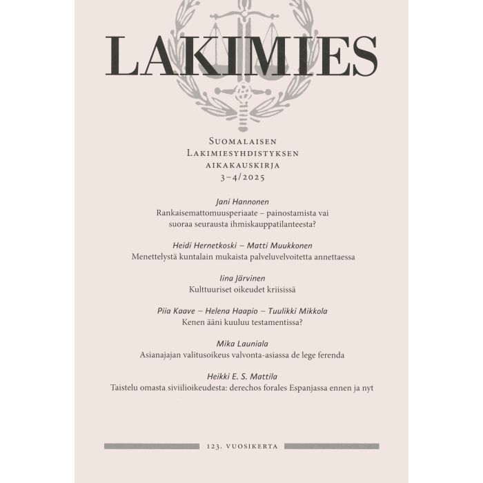 Lakimies 3-4/2025 sisältää mm. seuraavat artikkelit: Jani Hannonen, Rankaisemattomuusperiaate – painostamista vai suoraa seurausta ihmiskauppatilanteesta? Heidi Hernetkoski, Matti Muukkonen, Menettelystä kuntalain mukaista palveluvelvoitetta annettaessa; Iina Järvinen, Kulttuuriset oikeudet kriisissä; Piia Kaave, Helena Haapio, Tuulikki Mikkola, Kenen ääni kuuluu testamentissa? Mika Launiala, Asianajajan valitusoikeus valvonta-asiassa de lege ferenda; Heikki E. S. Mattila, Taistelu omasta siviilioikeudesta: derechos forales Espanjassa ennen ja nyt; Sampo Mielityinen, Asiantuntijuus juristin työssä – esimerkkinä lapsioikeudellinen asianajo; Essi Reinilä, Panttausilmoitukseen julkivarmistustapana kohdistuva muutospaine saatavien panttauksen ja julkisuusperiaatteen näkökulmasta.