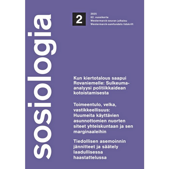 Sosiologia 2/2025 sisältää mm. seuraavat artikkelit: Teemu Loikkanen, Kun kiertotalous saapui Rovaniemelle: Sulkeuma-analyysi politiikkaidean kotoistamisesta; Keiju Vihreäsalo, Anna Leppo & Riikka Perälä: Toimeentulo, velka, vastikkeellisuus: Huumeita käyttävien asunnottomien nuorten siteet yhteiskuntaan ja sen marginaaleihin; Matti Hyvärinen, Hanna Rautajoki & Kari Teräs: Tiedollisen asemoinnin jännitteet ja säätely laadullisessa haastattelussa.
