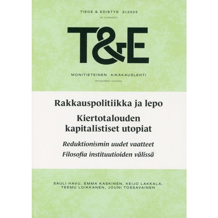 Tiede & edistys 2/2025 sisältää mm. seuraavat tutkimusartikkelit: Emma Kaskinen, Lepo antikapitalistisena vastarintana ja mustan feminismin perinne; Keijo Lakkala ja Teemu Loikkanen, Kiertotalouden kapitalistinen utopia: Nykyisyyden utooppiset vastakuvat Suomen itsenäisyyden juhlarahaston Sitran ja Ellen MacArthurin säätiön kiertotalousvisioissa.
